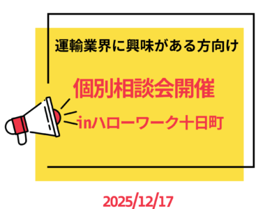 続きを読むいつもドライバーズエージェントをご利用いただきありがとうございます。2025年12月17日(水)、ハローワーク十日町にて運輸業界向け個別相談会を開催します! <運輸の仕事に興味がある方へ!個別相談会開催>相談…