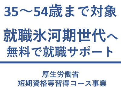 2020.09.29厚生労働省は「就職氷河期世代の方向けの短期資格等習得コース事業」を始めました。この事業は35歳から54歳までの就職氷河期世代の方が対象です。資格取得から希望の職場のマッチングまでサポートする内容になっています。事…