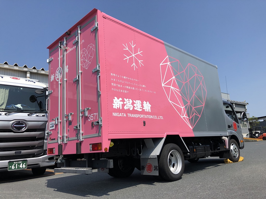 2017年に女性活躍機会の創出や定着、働く職場環境の改善を目的に「姫トラプロジェクト」を立ち上げ、2019年に女性ドライバーの声を反映させた女性専用車両の《姫トラ》が完成しました。ボディには新潟運輸のカラーであるシルバーをベースに、キャッチフレーズの「まごころをお届けする」を雪椿と物流網で表現したハートを、女性らしい色合いでラッピング。室内にはカーテンや収納を設けたり、UV カット仕様、パワーゲート仕様や乗務するドライバーの希望でマニュアル車を導入!安心して働ける職場環境づくりに努めています。