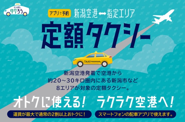 新潟空港発着で空港から約20~30キロ圏内にある新潟市など8エリアが対象の定額タクシー。乗車予定の3時間前までにアプリで事前予約をすれば利用可能なサービスです。通常にタクシーを利用するよりも最大2割以上お得なんです!大きな荷物を抱えてタクシーを探さなくても良いので、楽しい旅行や出張にとても便利です!